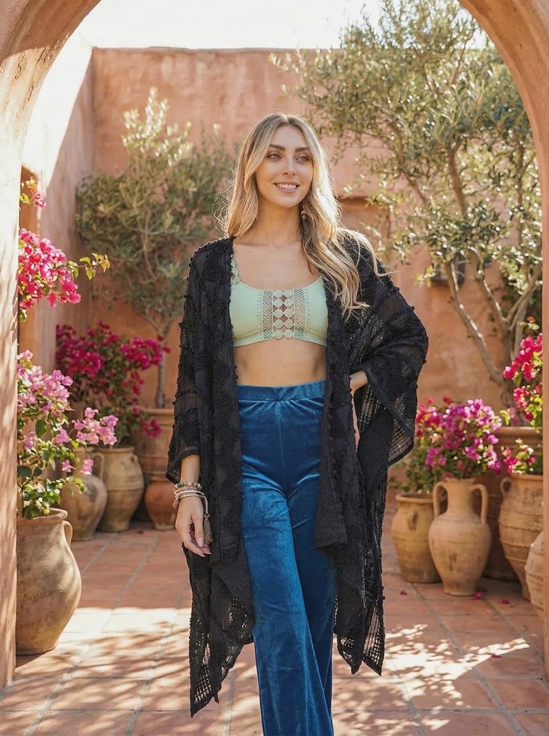 Cheyenne Embroidered Zig Zag Soft Kimono - Black
