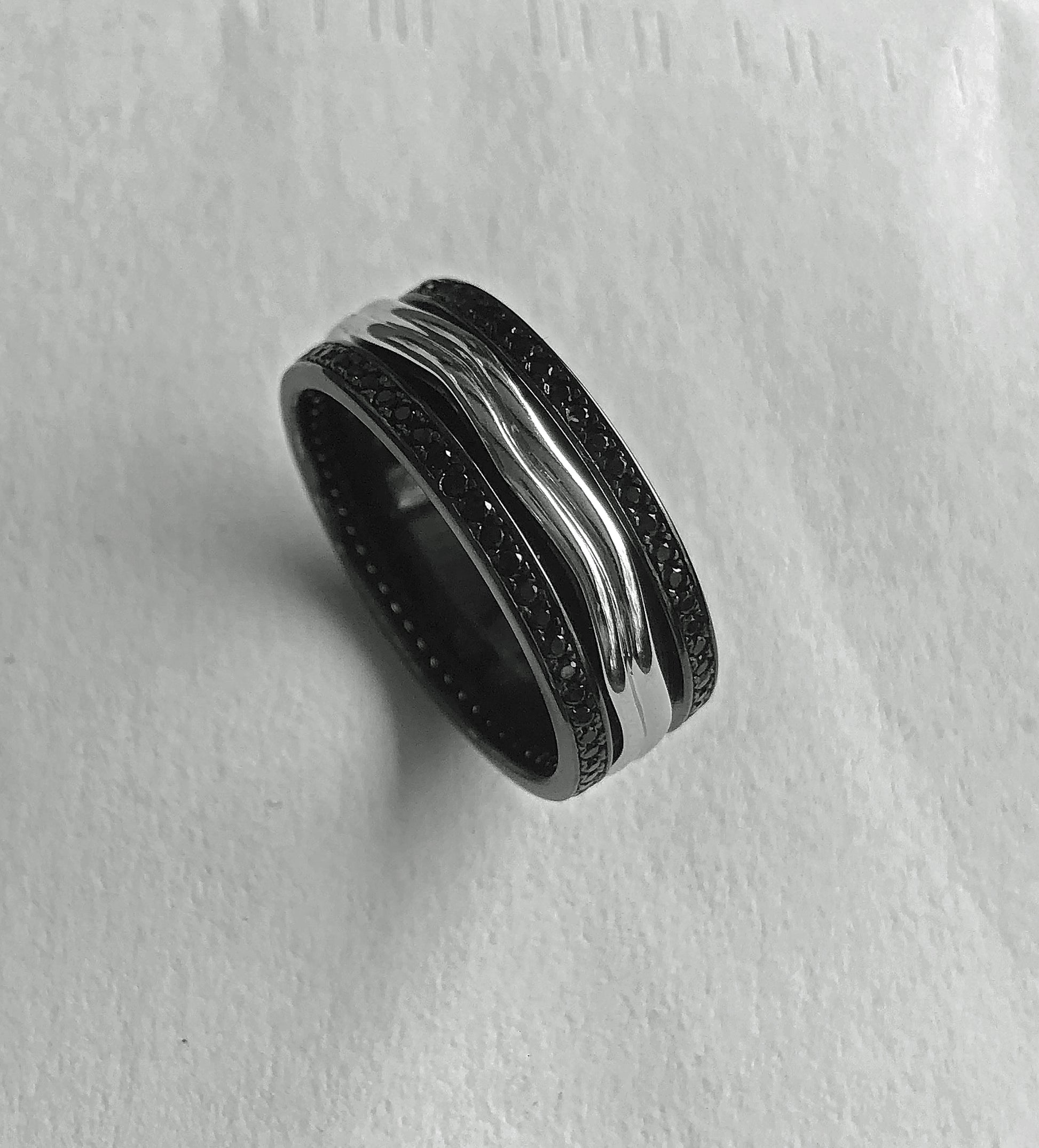 Make a bold statement with this Funky Rhodium & Stainless Steel Band Ring 🤩. Featuring a sleek stainless steel base plated with black rhodium and accented by a striking CZ inlay, this ring balances modern edge with simple elegance.