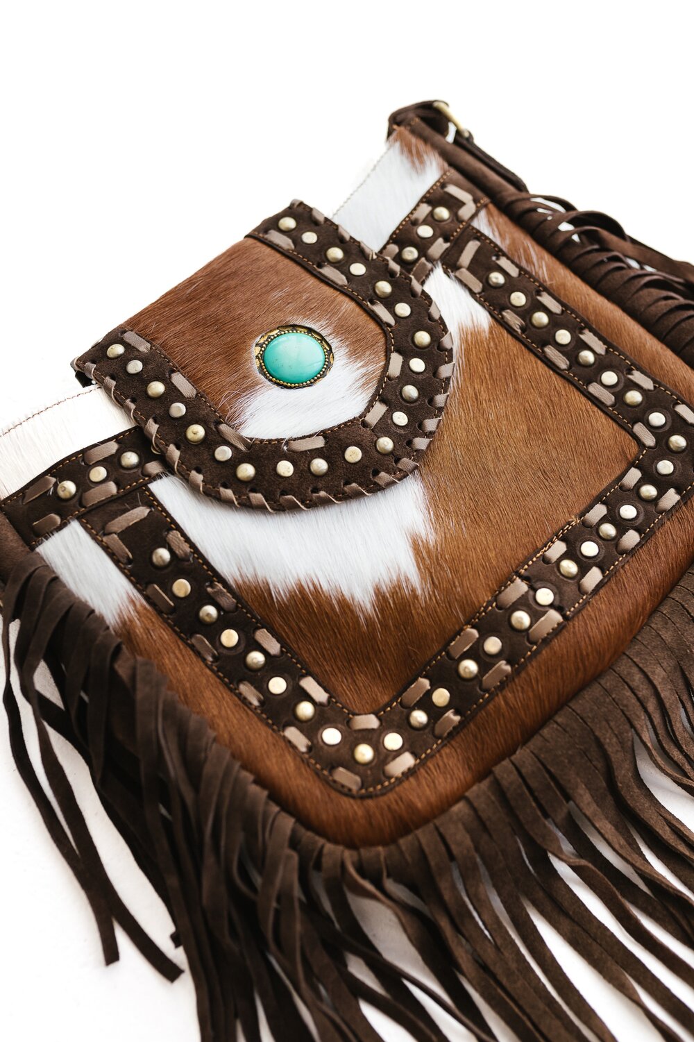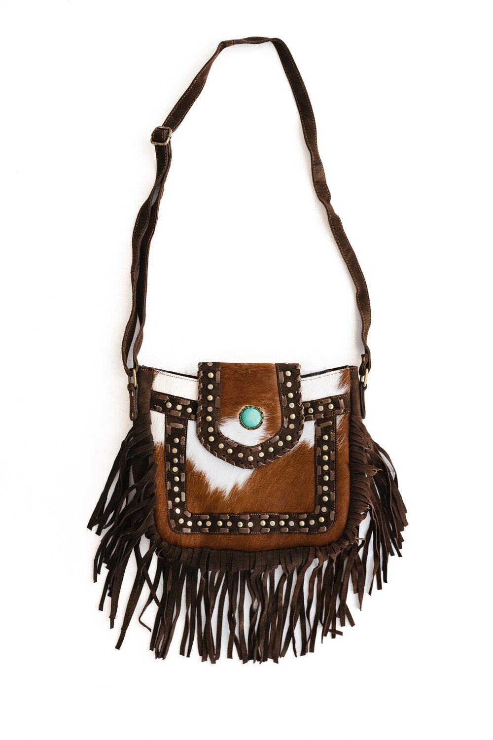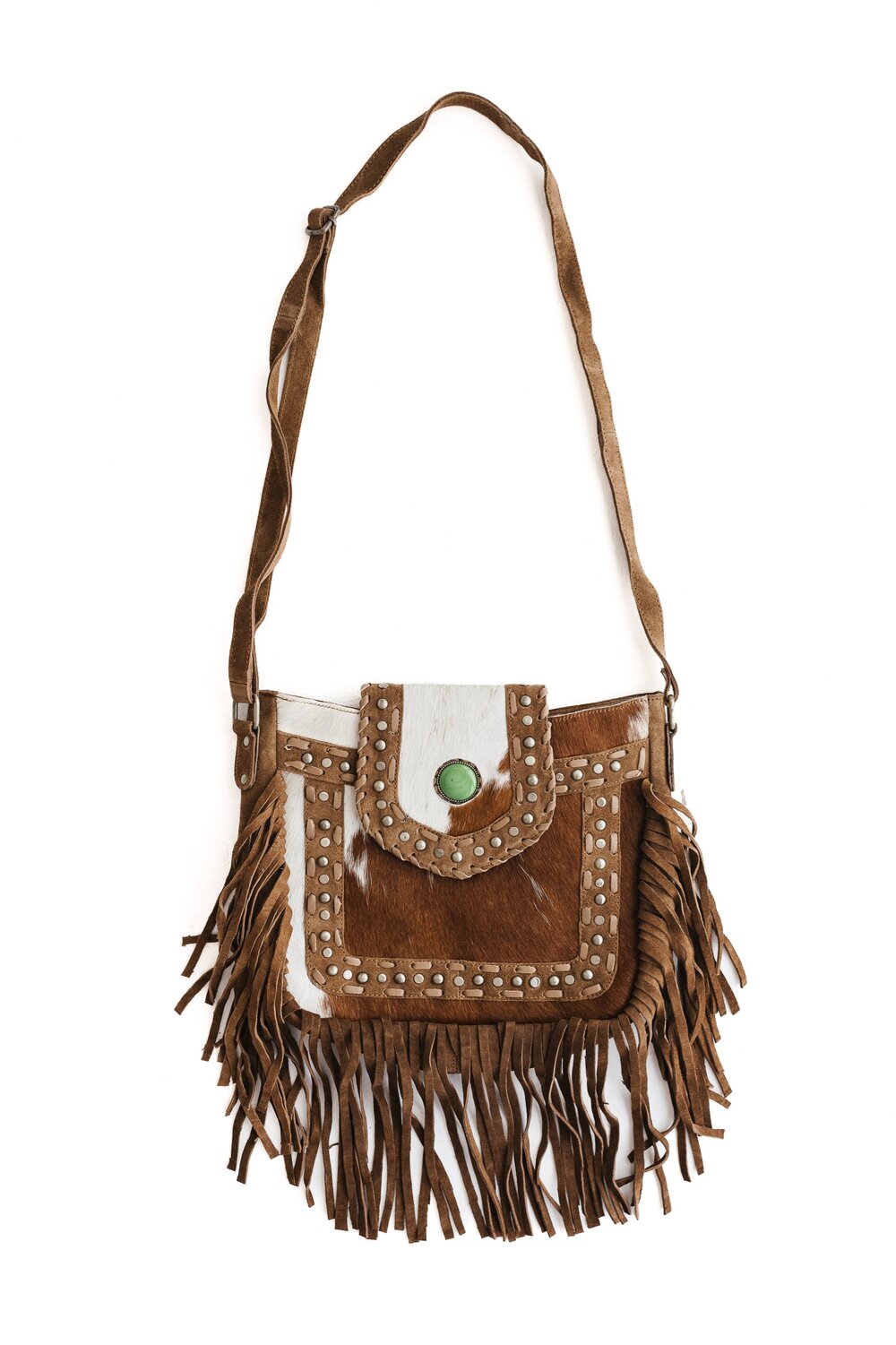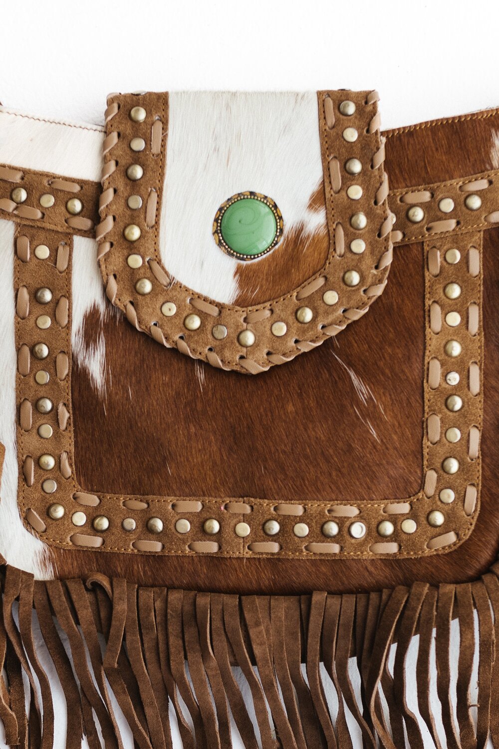Each piece is unique and features a large howlite stone, tassels, zip pocket inside and on the outside, open phone pocket inside and adjustable strap. There is also a zippered main compartment.